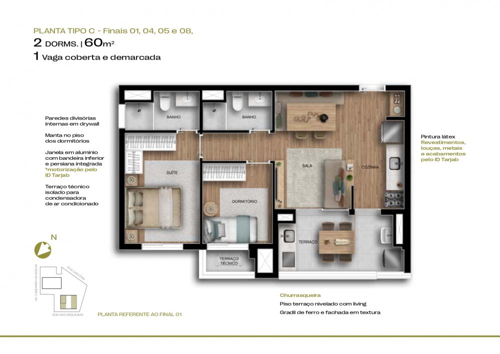 Este belíssimo apartamento, com 60m² de área privativa inteligentemente distribuídos, oferece: