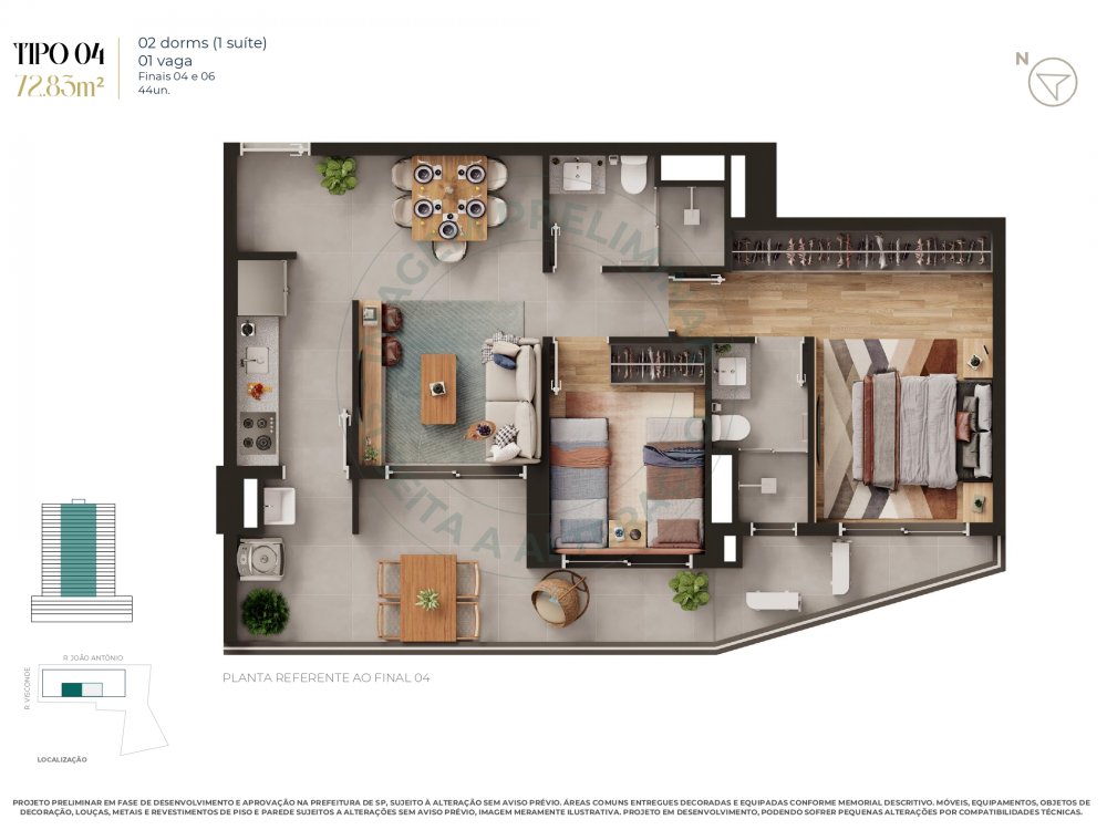 02 dormitórios com suíte, terraço com ponto grill, preparado para ar condicionado, entregue com persianas de enrrolar, vagas fixas sem sorteio, tratamento acústico entre andares para melhor conforto se sua família,