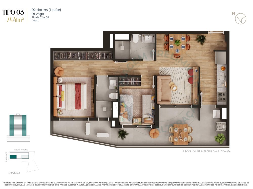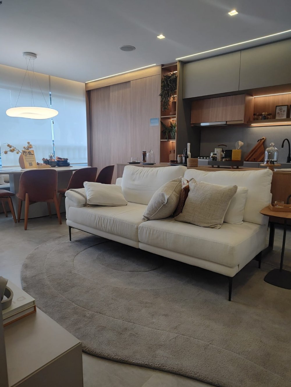 A sala, convidativa e luminosa, é perfeita para momentos de relaxamento e convívio. A cozinha americana, moderna e funcional, integra os ambientes e facilita o dia a dia. E para sua comodidade,